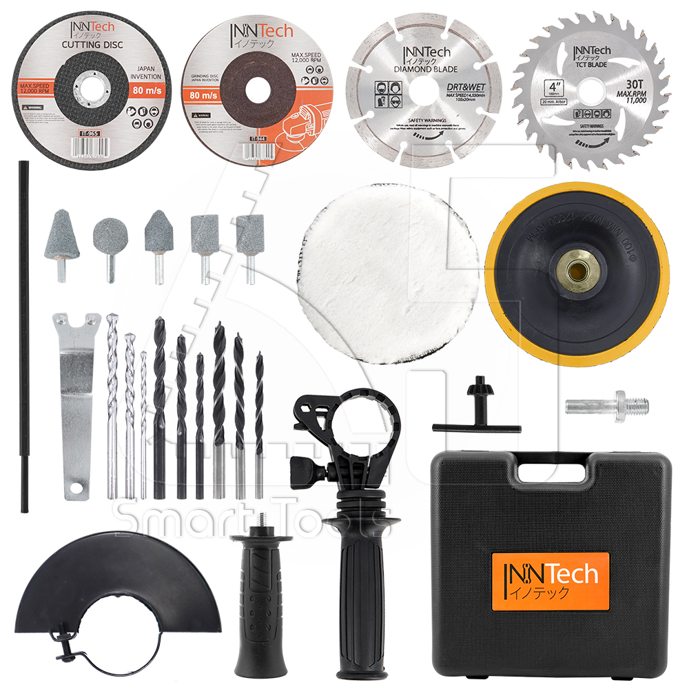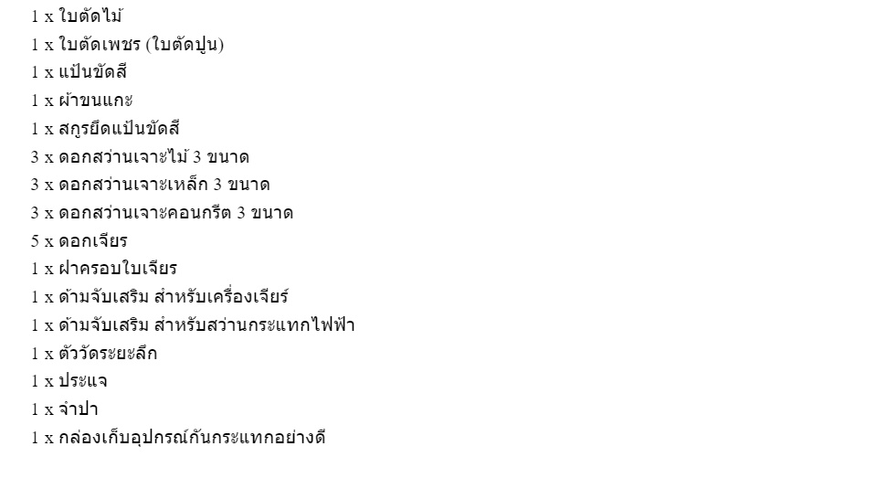 - แถมฟรีอุปกรณ์เสริมชุดใหญ่! ใบเจียร ใบตัดเหล็ก ใบตัดไม้ ใบตัดปูน ดอกสว่านเจาะไม้ / ปูน / เหล็ก ดอกเจียร แป้นขัดสี ขนแกะ และ อุปกรณ์ครบชุดรวม 30 ชิ้น