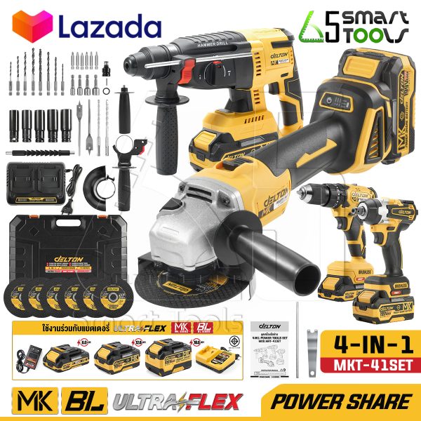- (แพ็ค 4) DELTON สว่านไร้สาย 3 ระบบ + บล็อกแบต & สว่าน + เครื่องเจียร์ไร้สาย 4 นิ้ว + สว่านโรตารี่ไร้สาย 199V รุ่น MKT-41SET ชุดเครื่องมือช่างสุดคุ้ม 4-in-1 ตอบโจทย์การใช้งานที่หลากหลาย ครบจบในกล่องเดียว