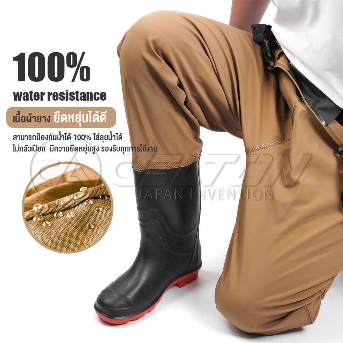 • รองเท้าบู๊ทเชื่อมติดกับกางเกงเป็นชิ้นเดียวกันไร้รอยต่อ ผลิตด้วยการเชื่อมด้วยความร้อน ไม่มีตะเข็บ ไม่ใช้กาว ป้องกันน้ำเข้าได้อย่างสมบูรณ์แบบ