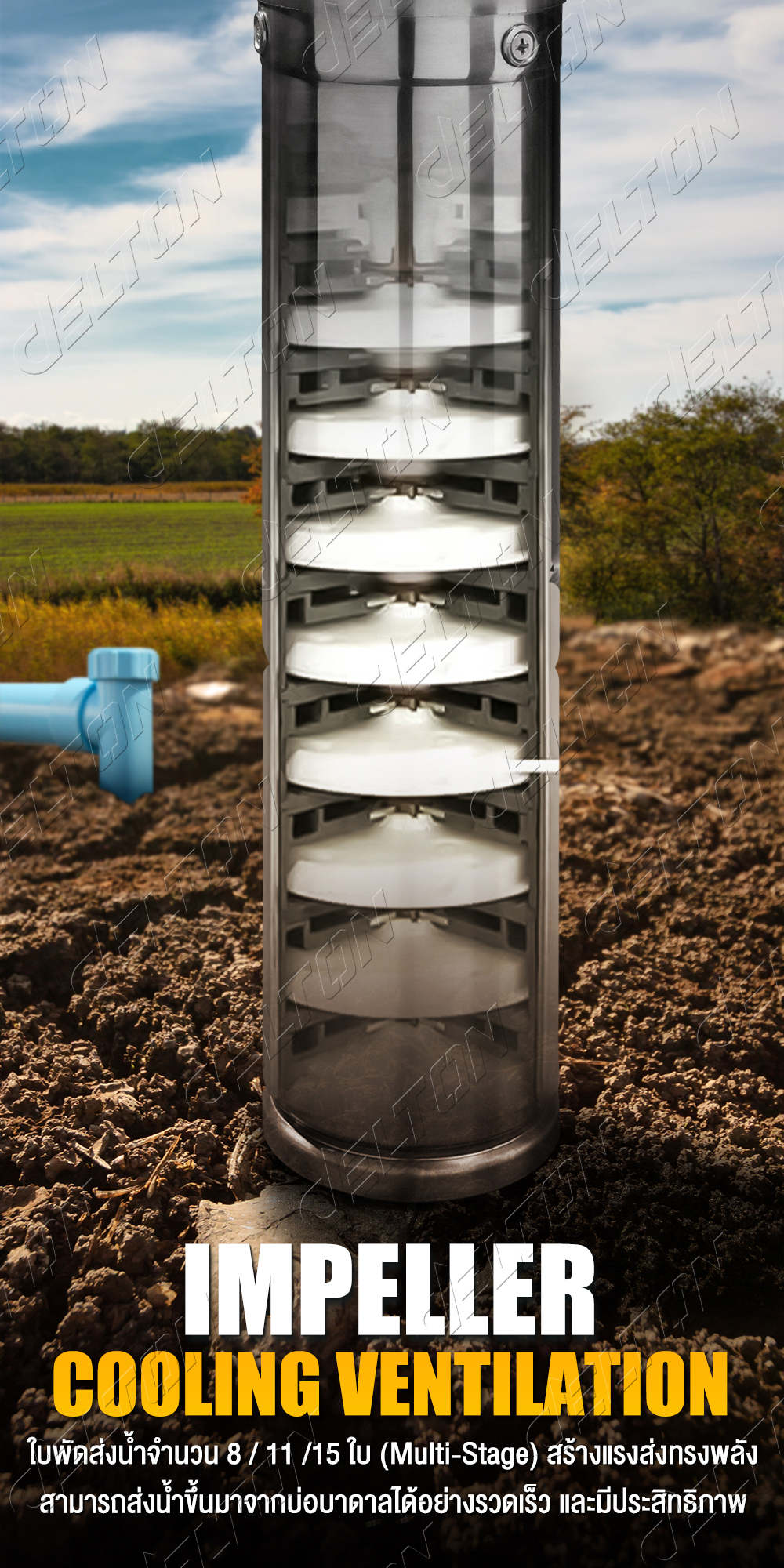 ใบพัดจำนวน 8 / 11 / 15 ใบ (ตามตัวเลือกสินค้า) Multi-Stage สร้างแรงส่งทรงพลัง สามารถส่งน้ำขึ้นมาจากบ่อบาดาลได้อย่างรวดเร็ว และมีประสิทธิภาพ สำหรับงานเกษตรทุกรูปแบบ