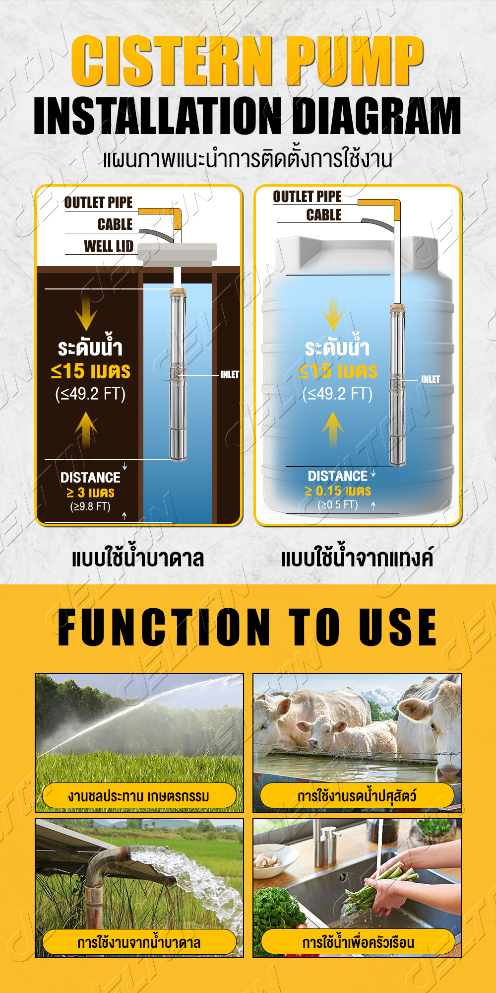 • เหมาะสำหรับใช้งานกับบ่อน้ำบาดาล งานสูบน้ำบาดาล งานเกษตรทั่วไป ไร่นา สวน และฟาร์ม งานติดตั้งระบบสปริงเกอร์ ใช้ในครัวเรือน ไปจนถึงงานอุตสาหกรรม