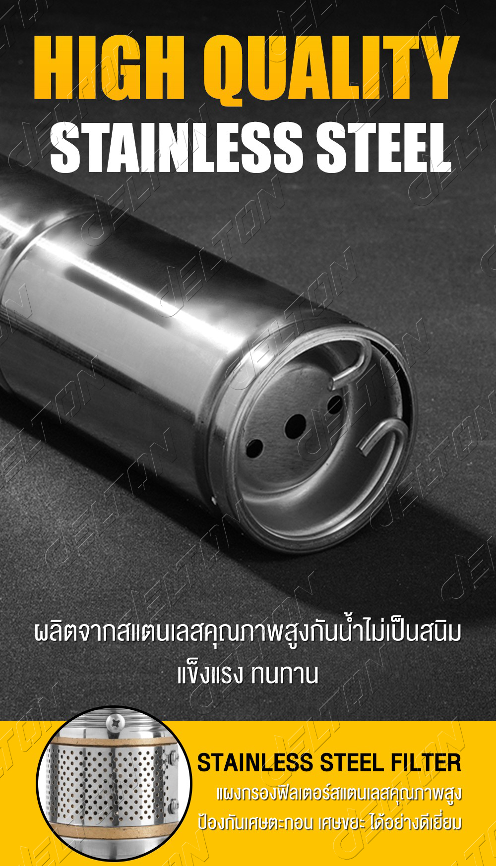 • แผงกรองน้ำสแตนเลสคุณภาพสูง (Stainless Steel Filter) ช่วยป้องกันหินและวัสดุต่างๆ ไม่ให้เกิดการอุดตัน แข็งแรง ทนทาน และ ไม่เป็นสนิม