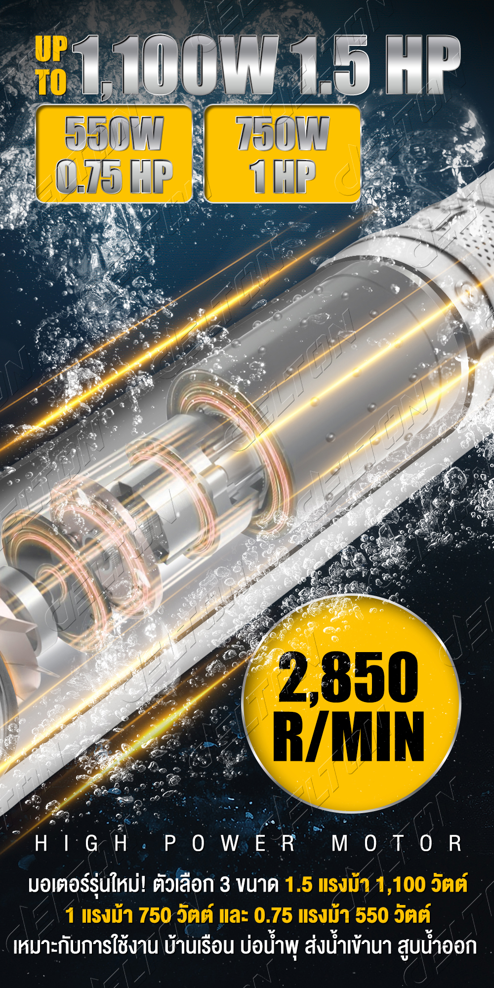 • มอเตอร์ทรงพลัง 550 วัตต์ 0.75 แรงม้า / 750 วัตต์ 1 แรงม้า / 1,100 วัตต์ 1.5 แรงม้า (ตามตัวเลือกสินค้า) ประสิทธิภาพการทำงานสูง ส่งน้ำแรงเต็มกำลัง สำหรับบ่อบาดาล