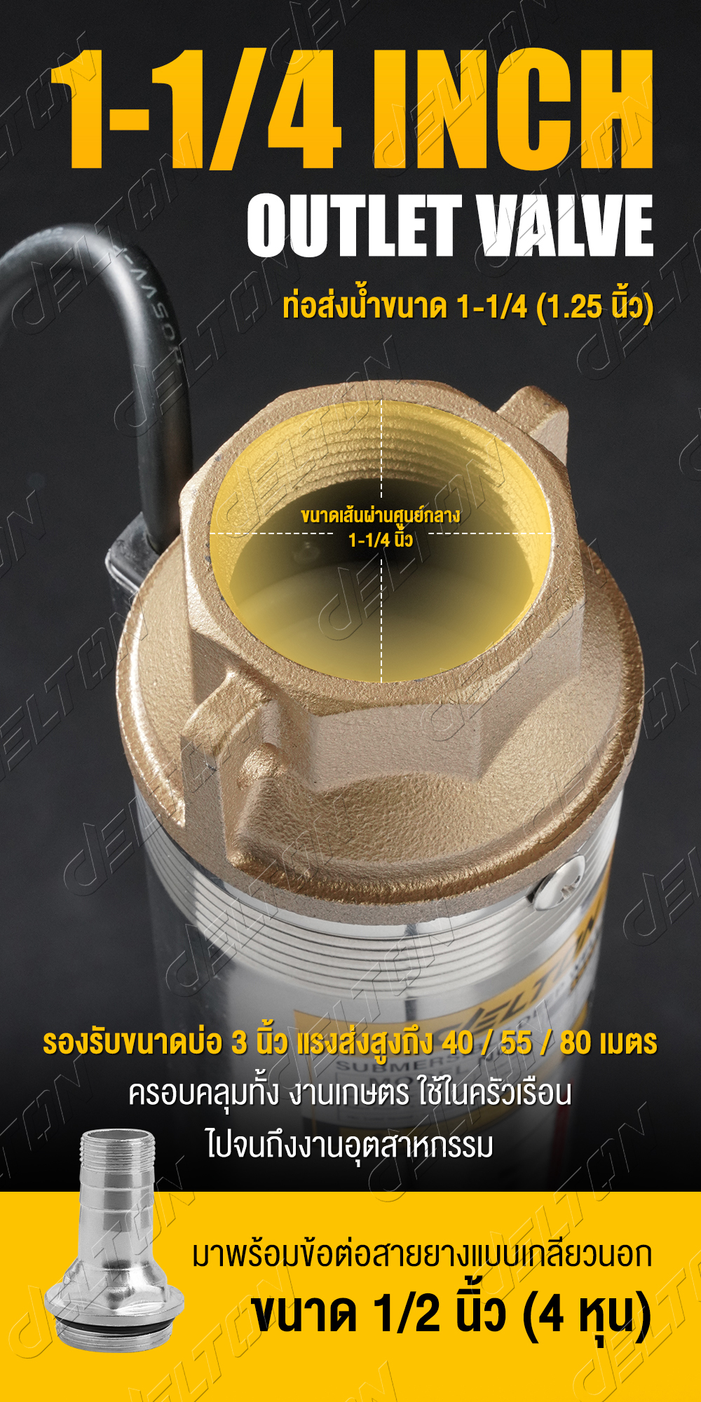 • ขนาดท่อส่งน้ำ 1-1/4 (1.25 นิ้ว) มาพร้อมข้อต่อสายยางแบบเกลียวนอกขนาด 1/2 นิ้ว (4 หุน)
