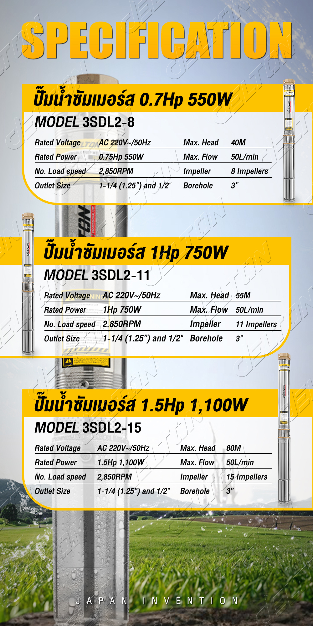 • รองรับขนาดบ่อ 3 นิ้ว สามารถสูบน้ำได้ลึกถึง 40 / 55 / 80 เมตร (ตามตัวเลือกสินค้า)
