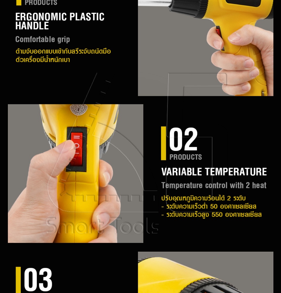 - ปรับระดับอุณหภูมิความร้อนได้ 50-550 องศาเซลเซียส