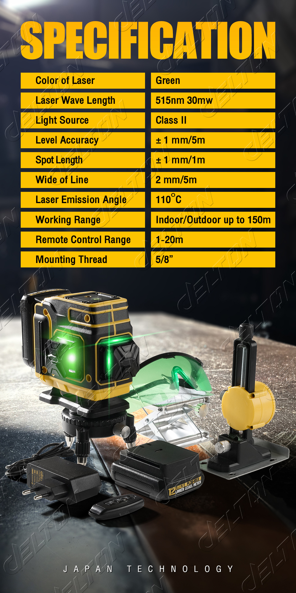 • เลเซอร์ 3 มิติ ครอบคลุมทิศทางการวัดได้ 360 องศา สร้างเส้นประสาน 12 เส้น เพื่อให้ได้เส้น 3 มิติ