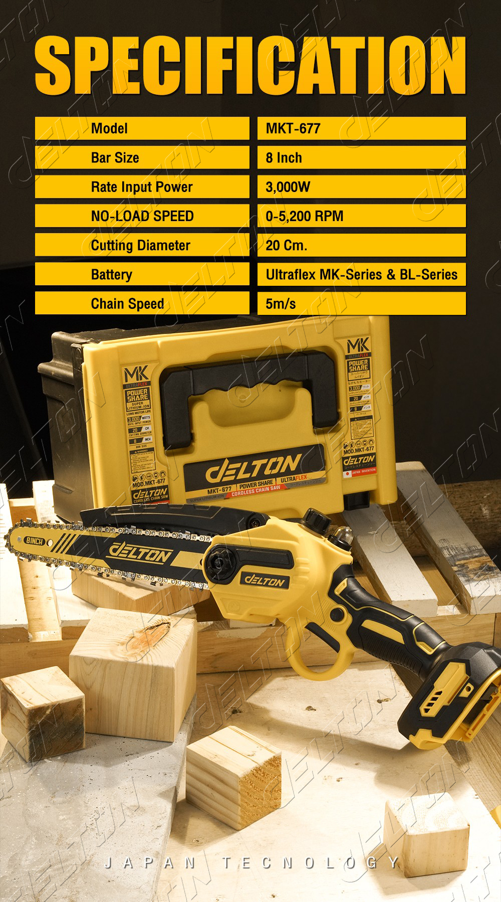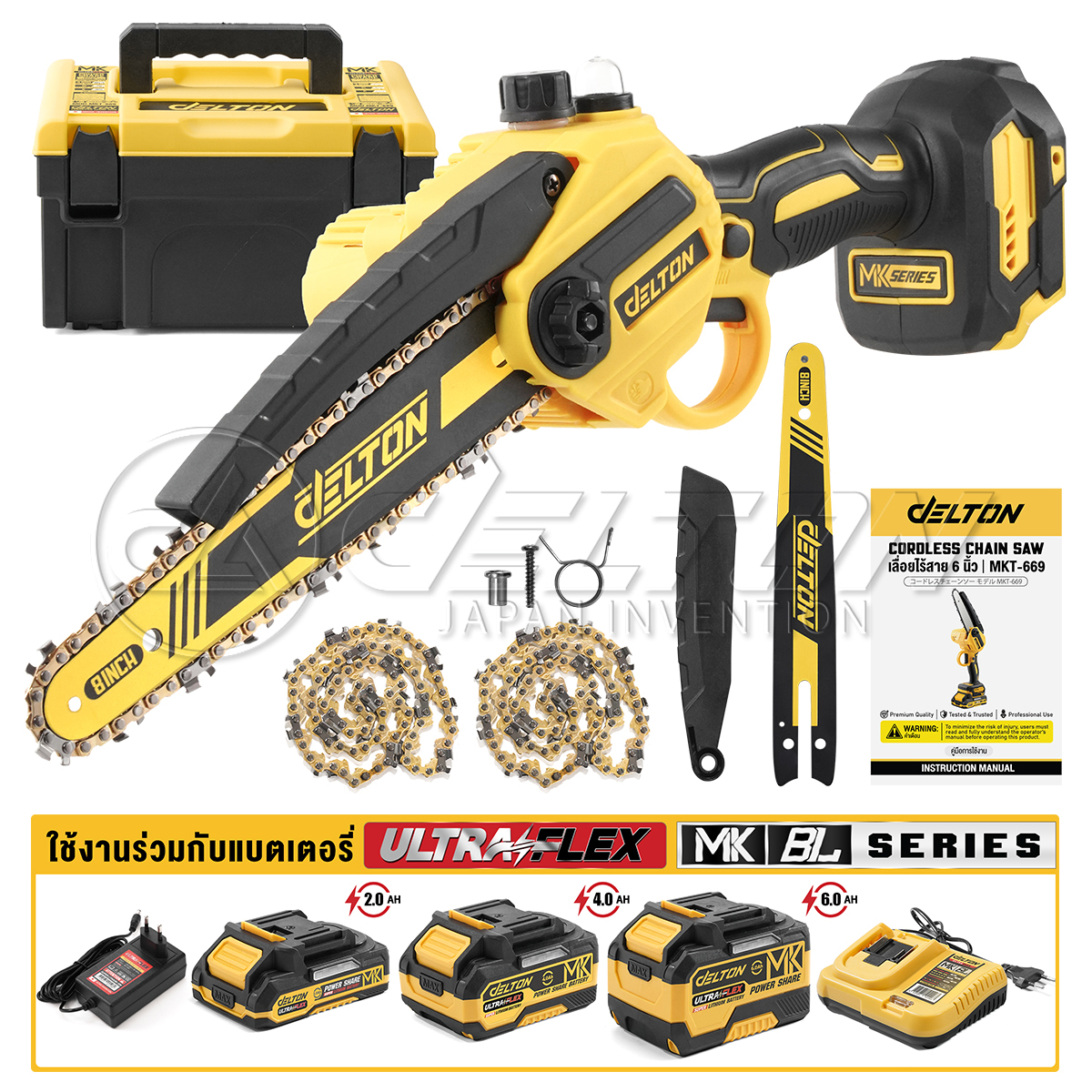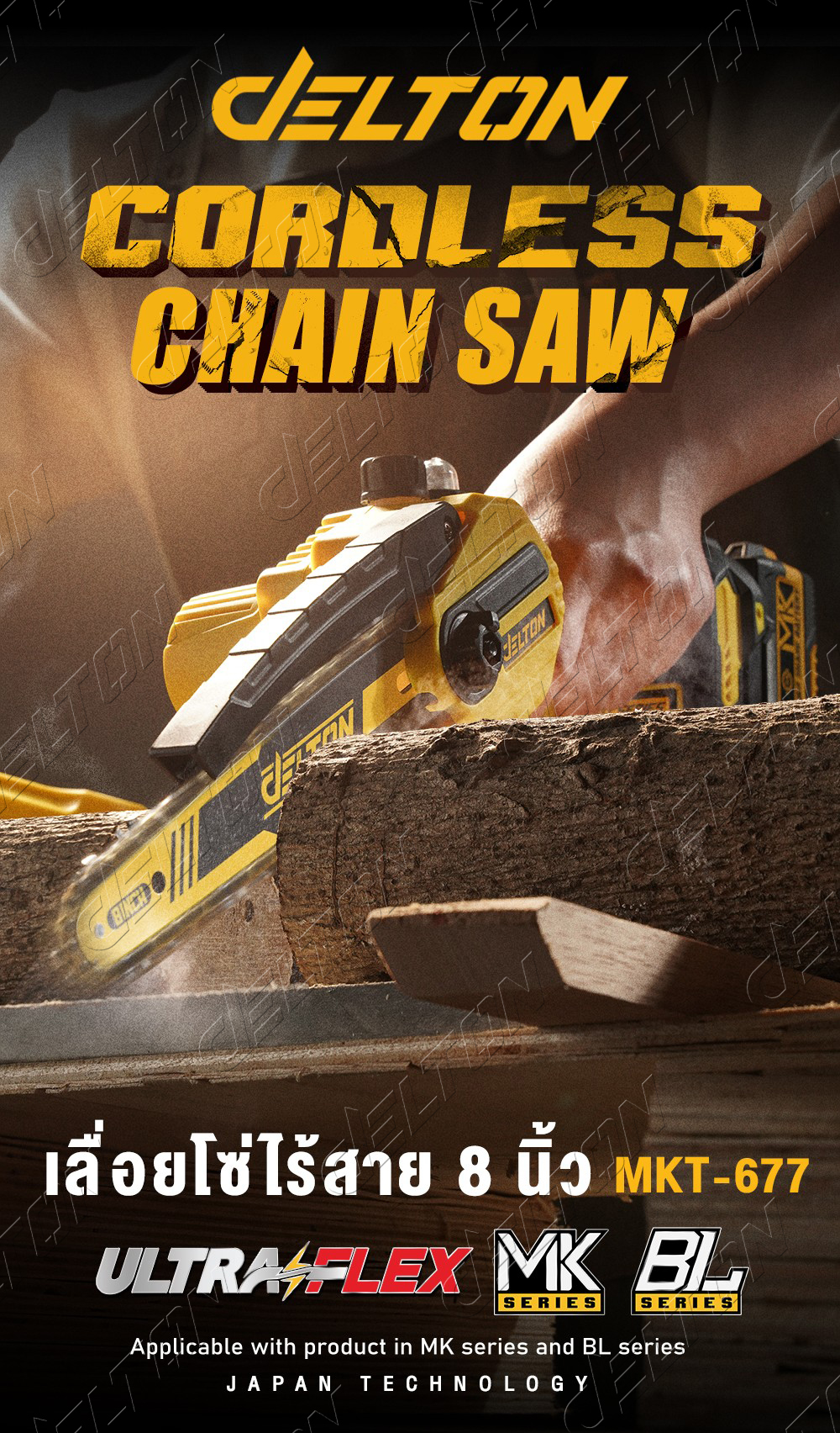 เลื่อยตัดไม้ เลื่อยไร้สาย เลื่อยยนต์ ไร้สาย MK Series รุ่น MKT-677 แถมฟรี! โซ่เลื่อยพรีเมียมสีทอง 2 เส้น Cordless Chain Saw ใช้งานร่วมกับ DELTON UltraFlex แบตเตอรี่ Power Share กลุ่ม MK-Series