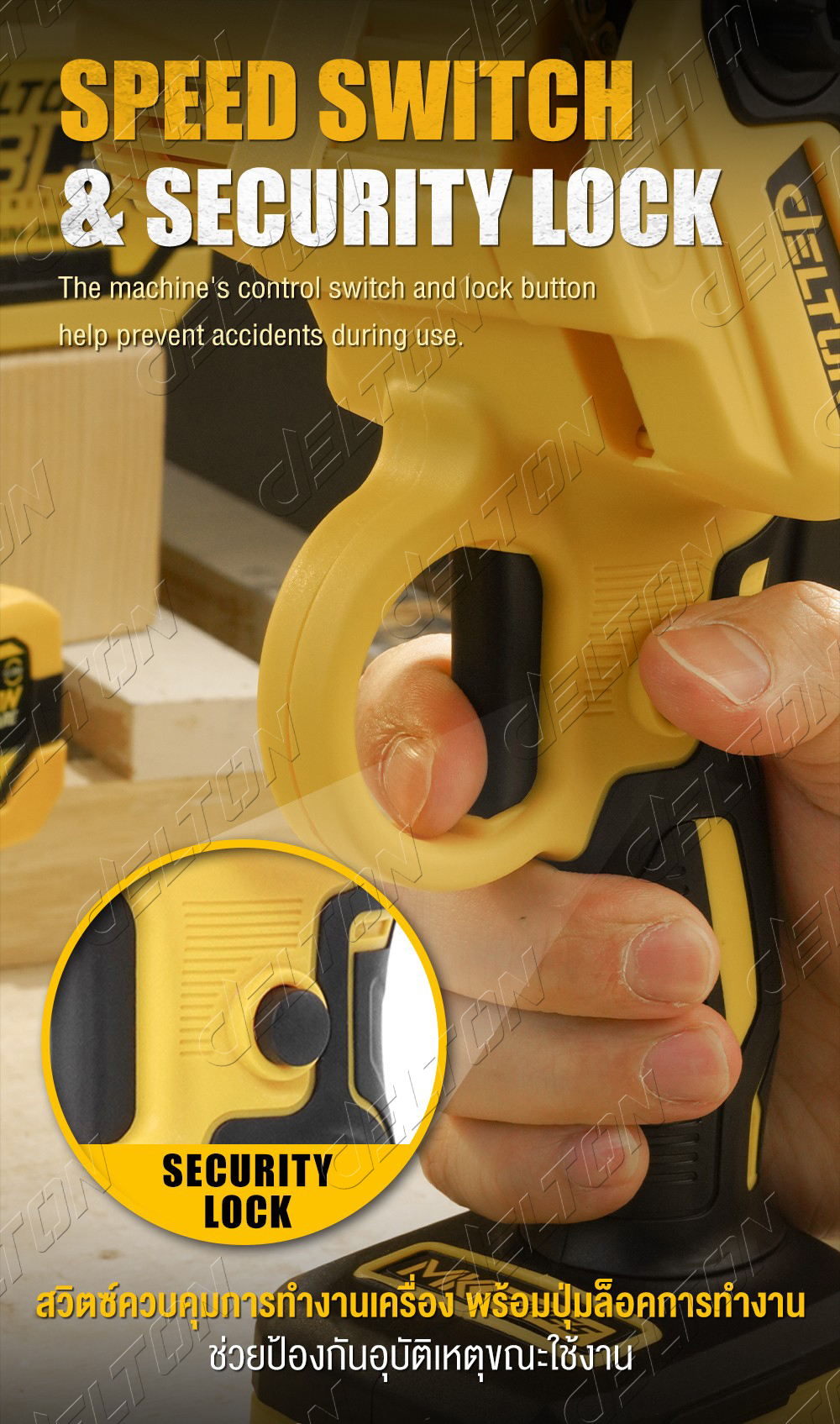 • มีปุ่มเซฟตี้สวิตซ์ป้องกันอุบัติเหตุ โดยจะไม่สามารถกดไกสวิตซ์ได้หากไม่กดปุ่มเซฟตี้ ช่วยเพิ่มความปลอดภัย ขณะใช้งาน
