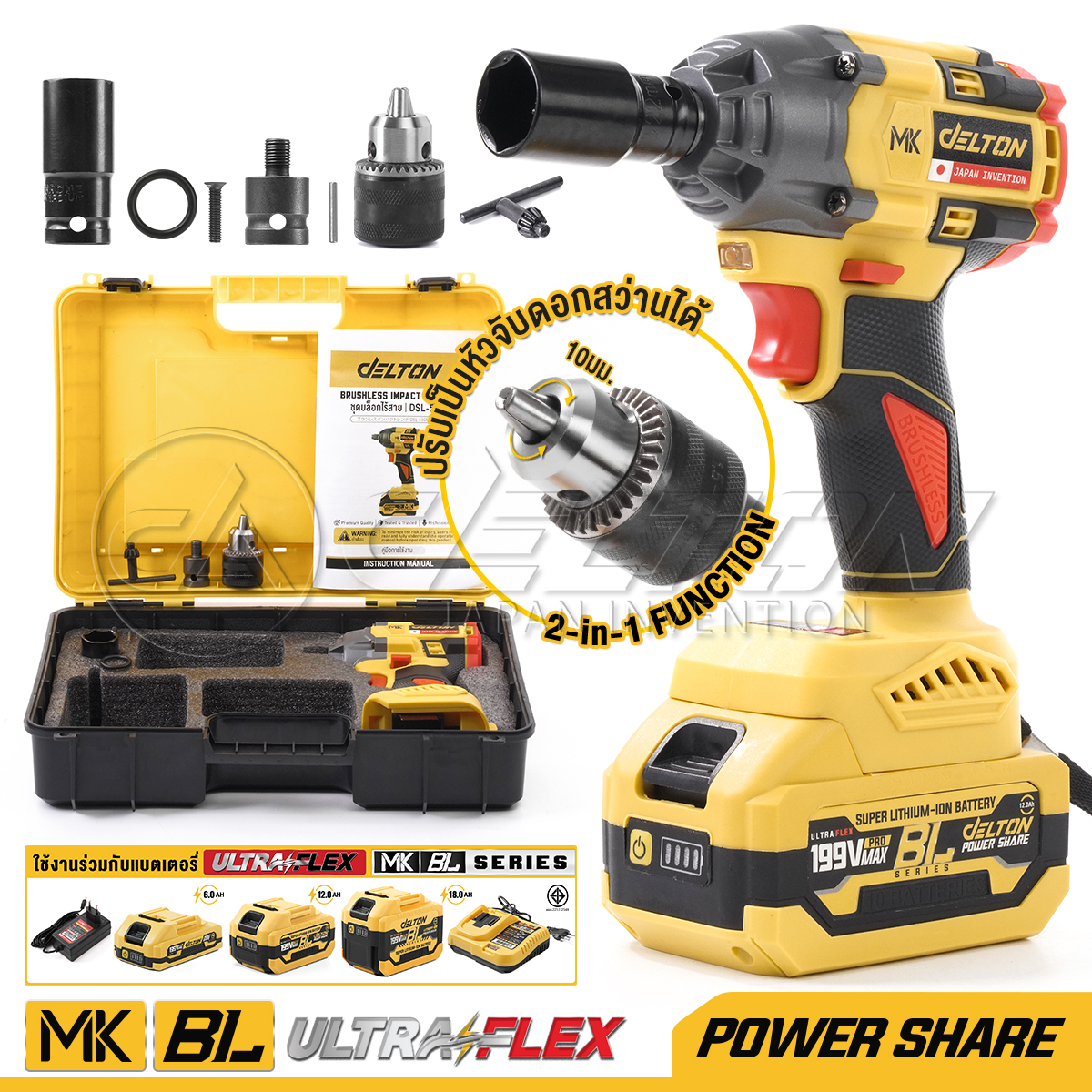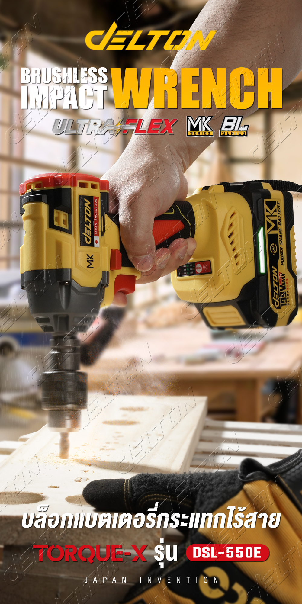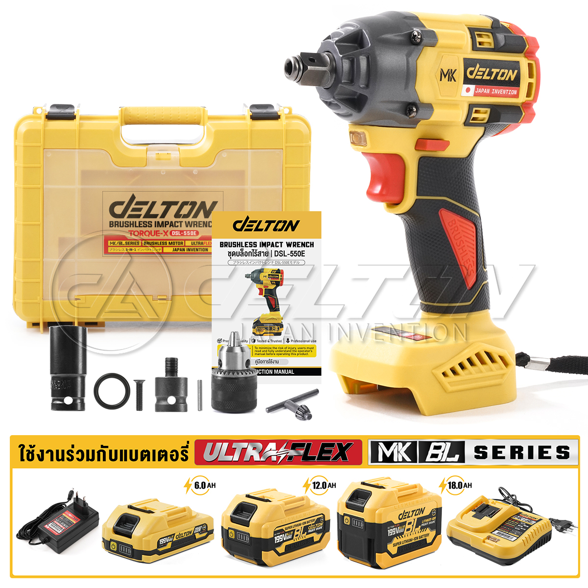 บล็อกแบต & สว่าน มอเตอร์ BRUSHLESS ไร้แปรงถ่าน TORQUE-X รุ่น DSL-550E บล็อคไฟฟ้าไร้สาย 1/2นิ้ว 550NM บล็อกไฟฟ้า บล็อกไร้สาย BL Series ใช้งานร่วมกับ DELTON UltraFlex แบตเตอรี่ Power Share กลุ่ม BL-Series