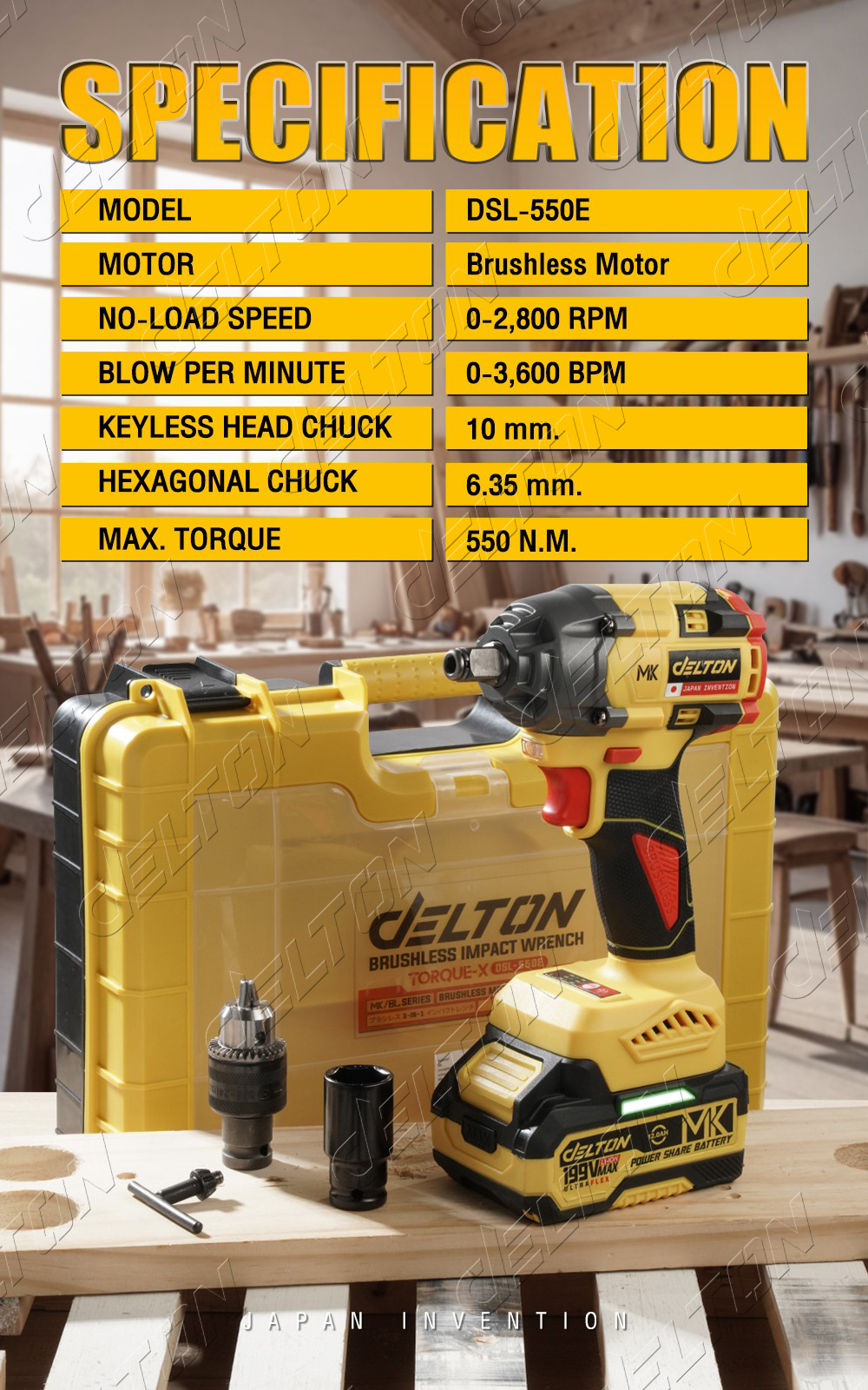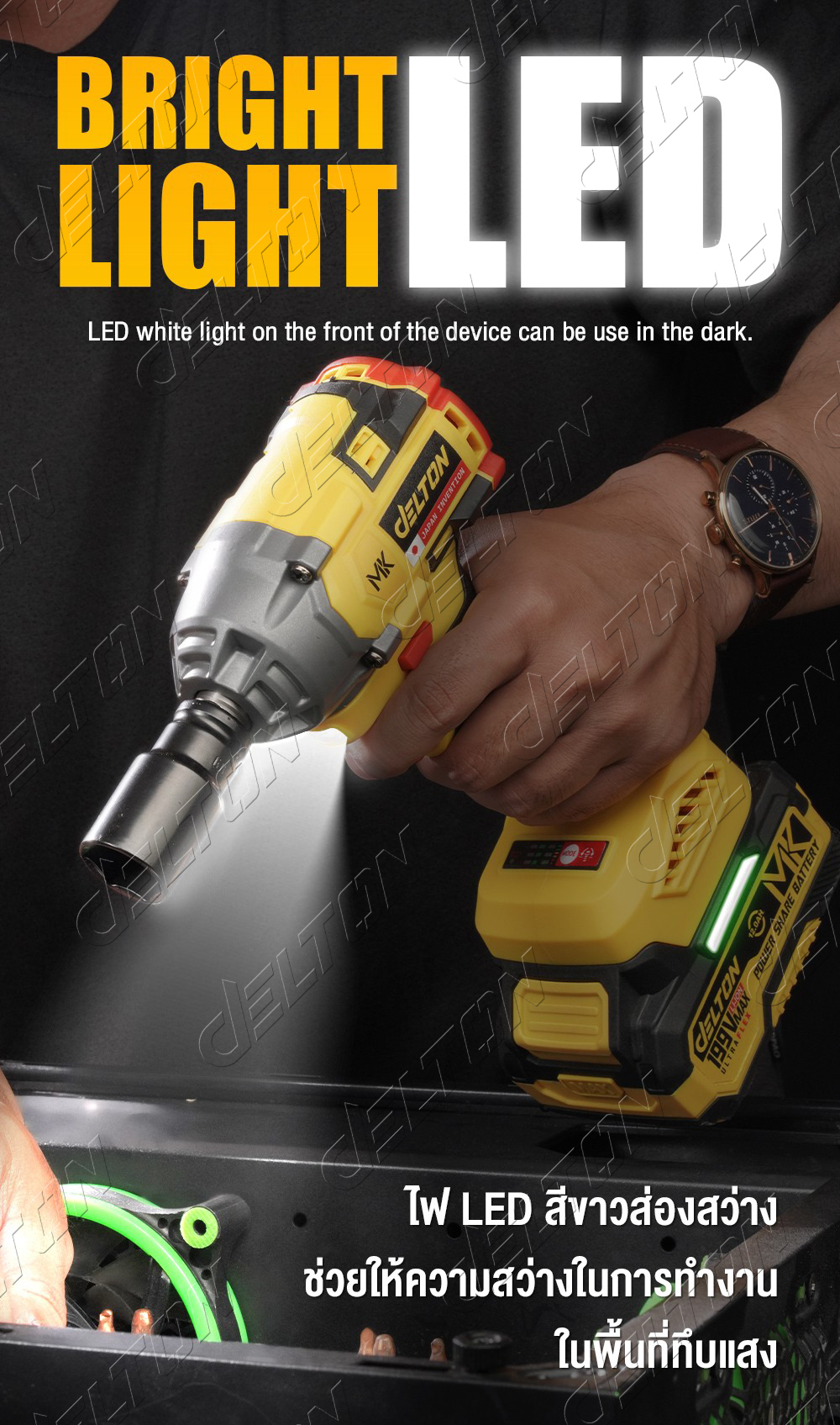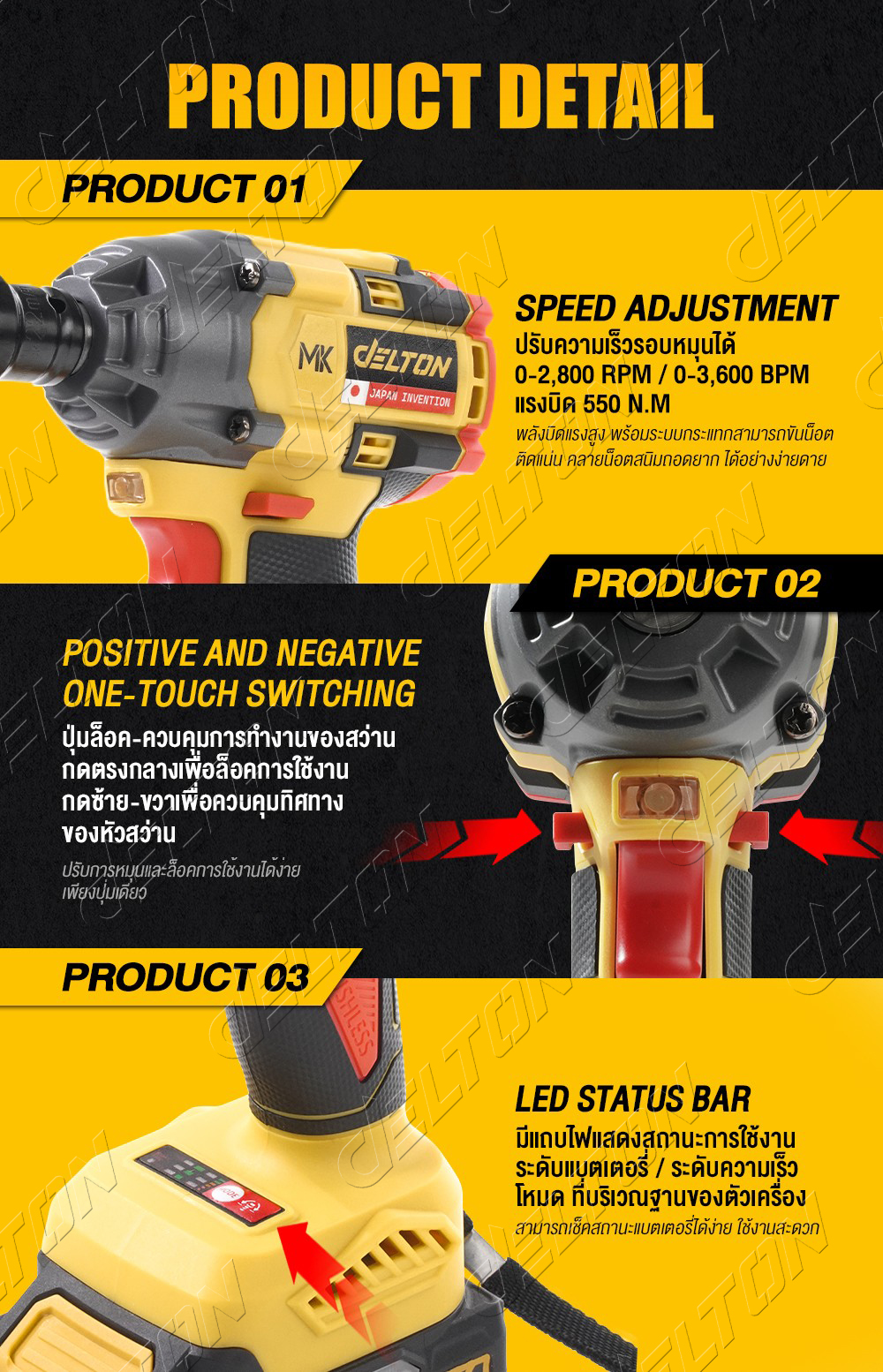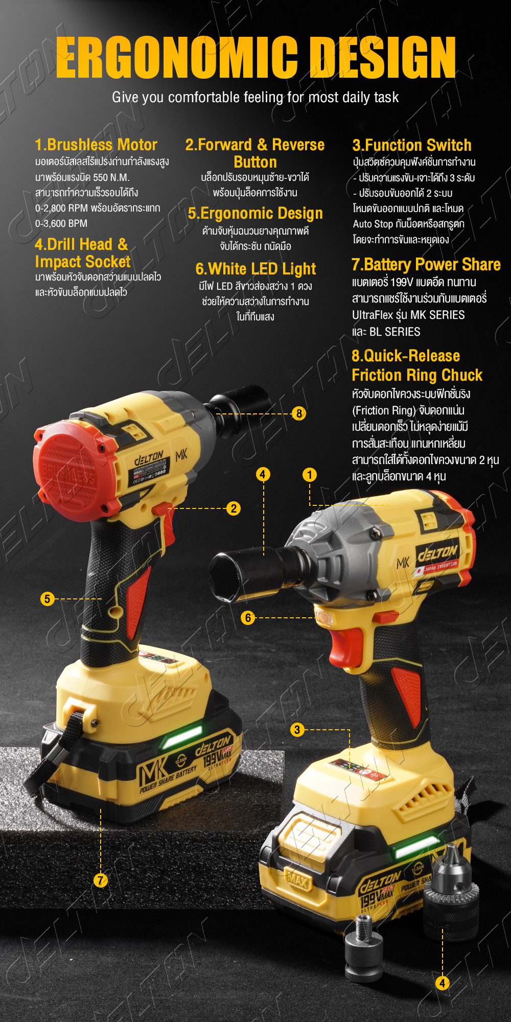 • DELTON บล็อกแบตเตอรี่ บล็อกกระแทกไร้สาย 199V TORQUE-X รุ่น DSL-550E