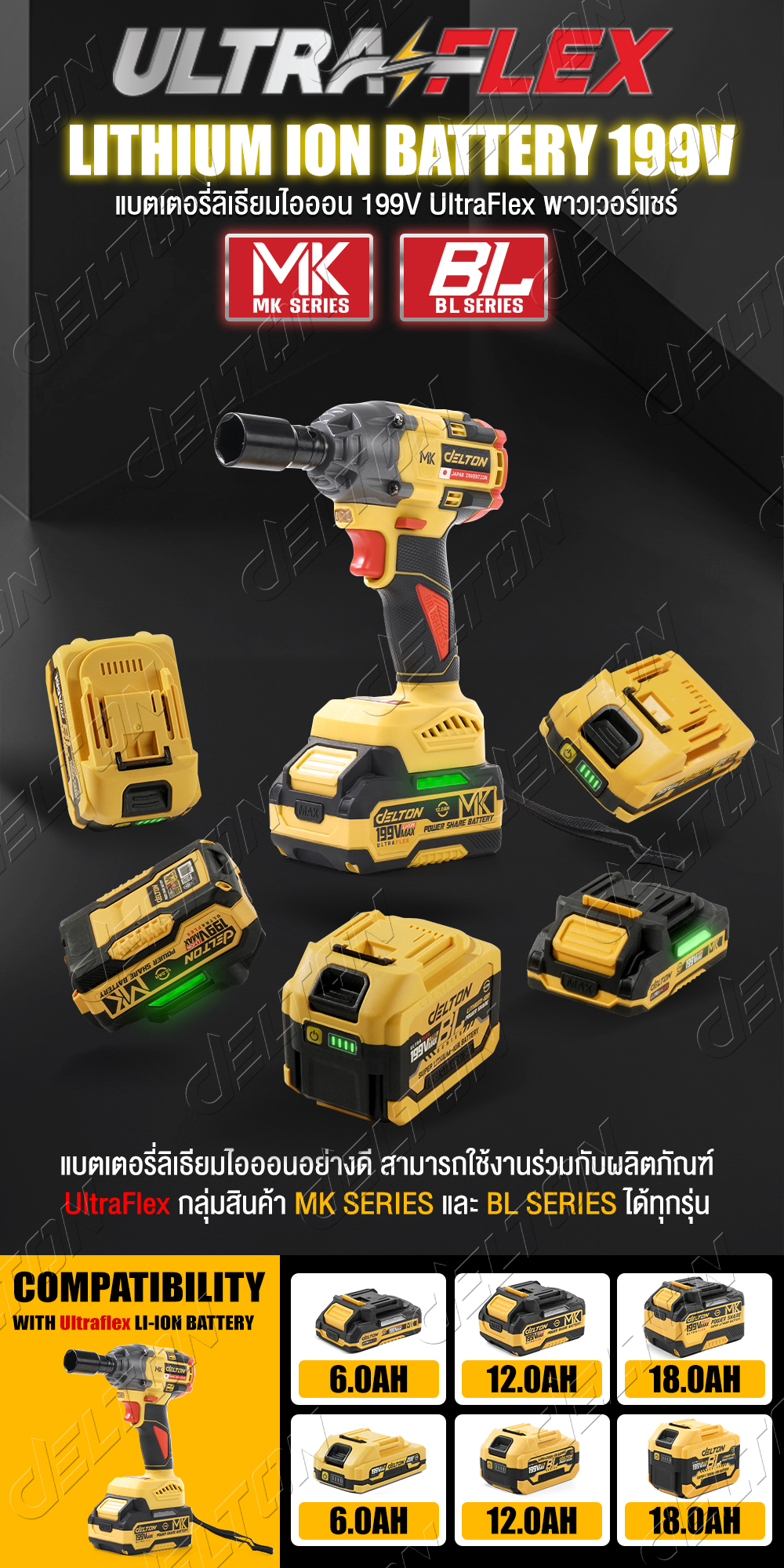 สามารถใช้งานร่วมกับเครื่องมือช่าง แบตเตอรี่ และสายชาร์จพาวเวอร์แชร์ (Power Share) DELTON UltraFlex กลุ่ม MK-Series และ BL-Series ได้