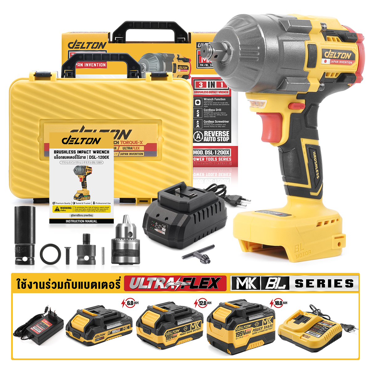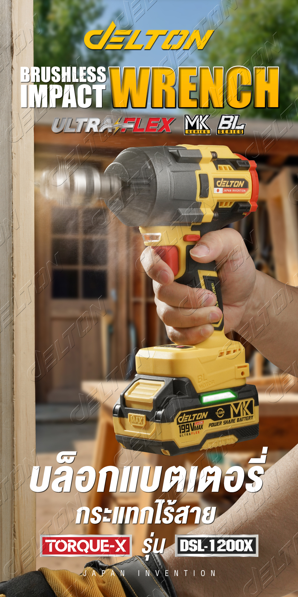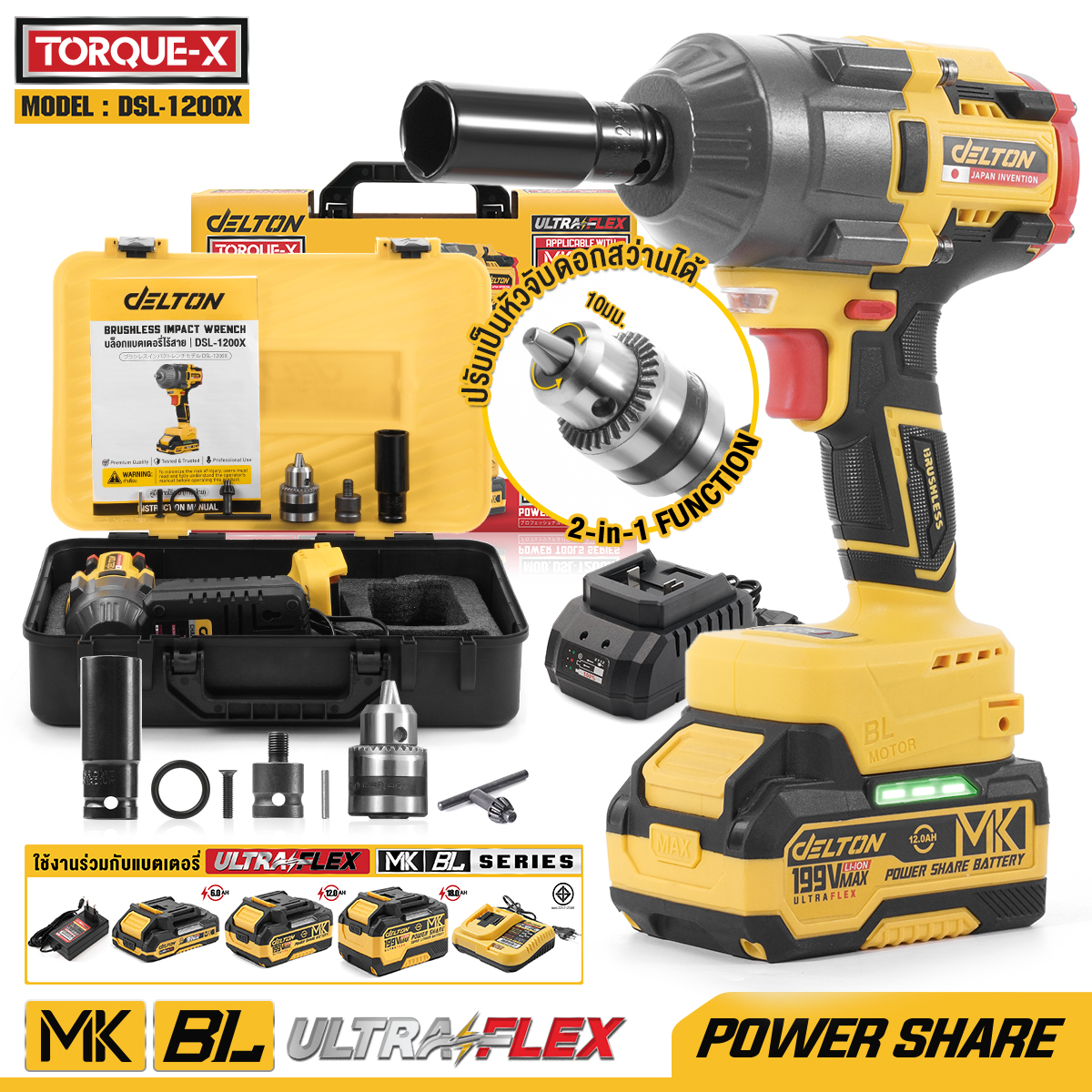 บล็อกแบต & สว่าน มอเตอร์ BRUSHLESS ไร้แปรงถ่าน TORQUE-X รุ่น DSL-1200X บล็อคไฟฟ้าไร้สาย 1/2นิ้ว 880NM บล็อกไฟฟ้า บล็อกไร้สาย MK Series ใช้งานร่วมกับ DELTON UltraFlex แบตเตอรี่ Power Share กลุ่ม MK-Series