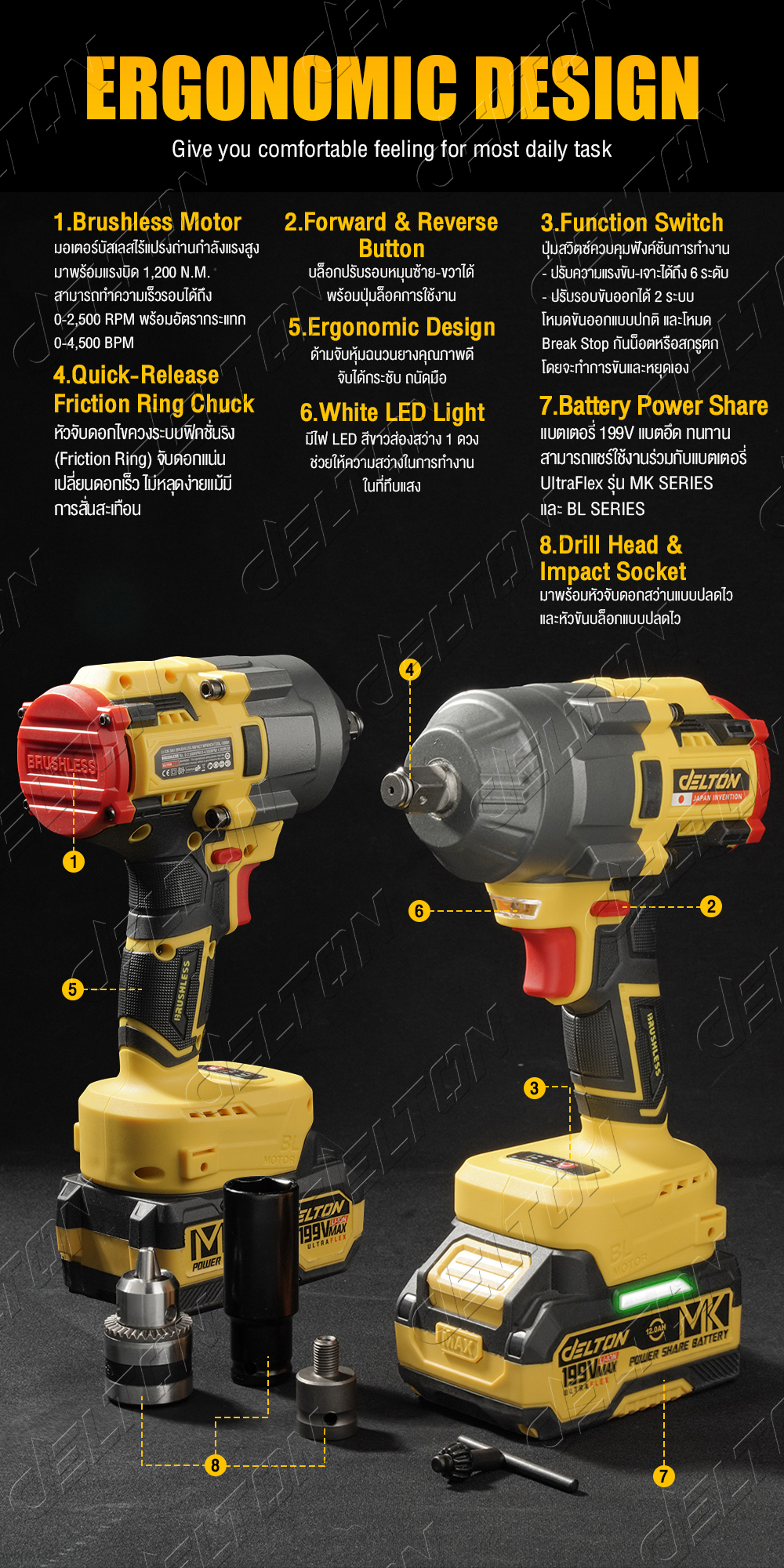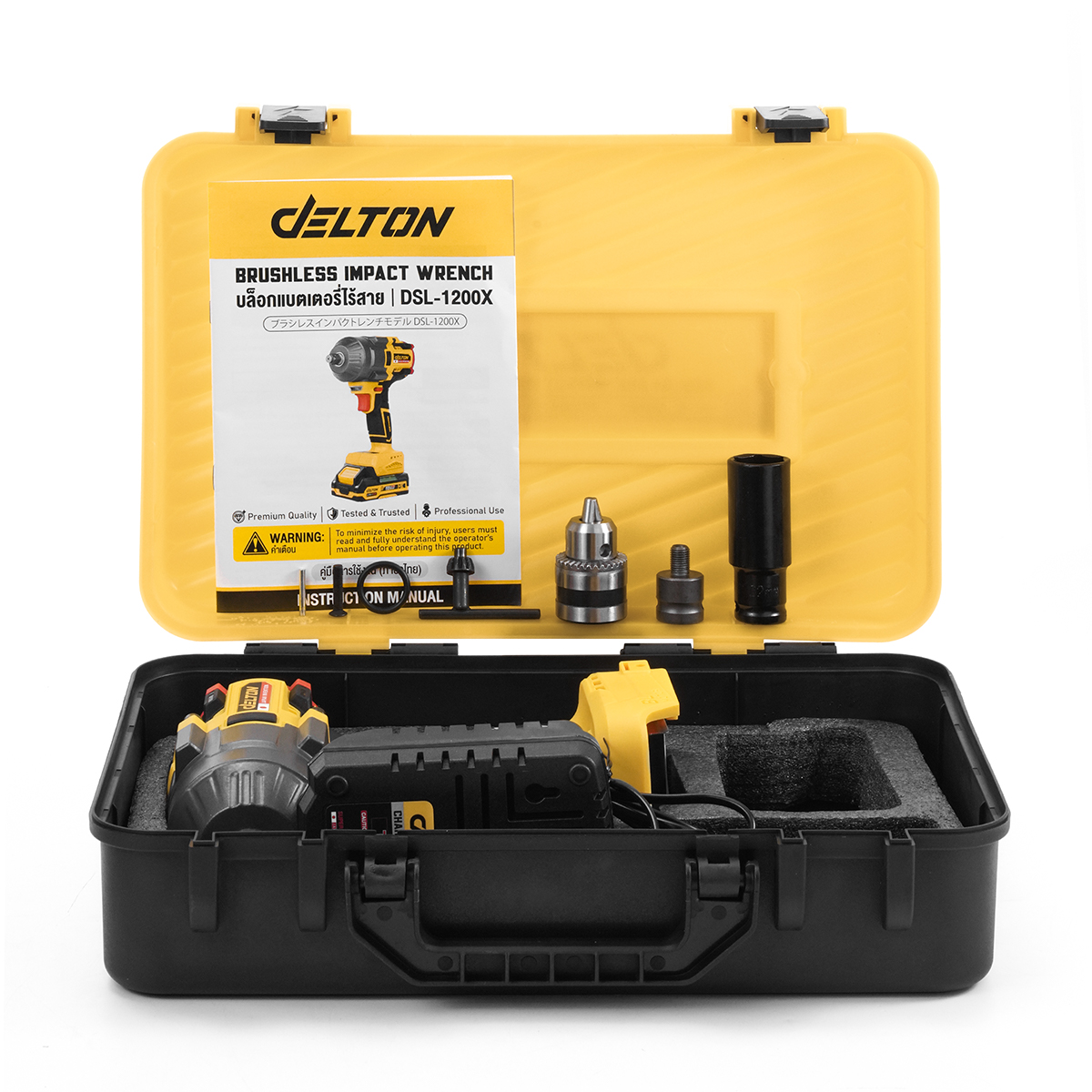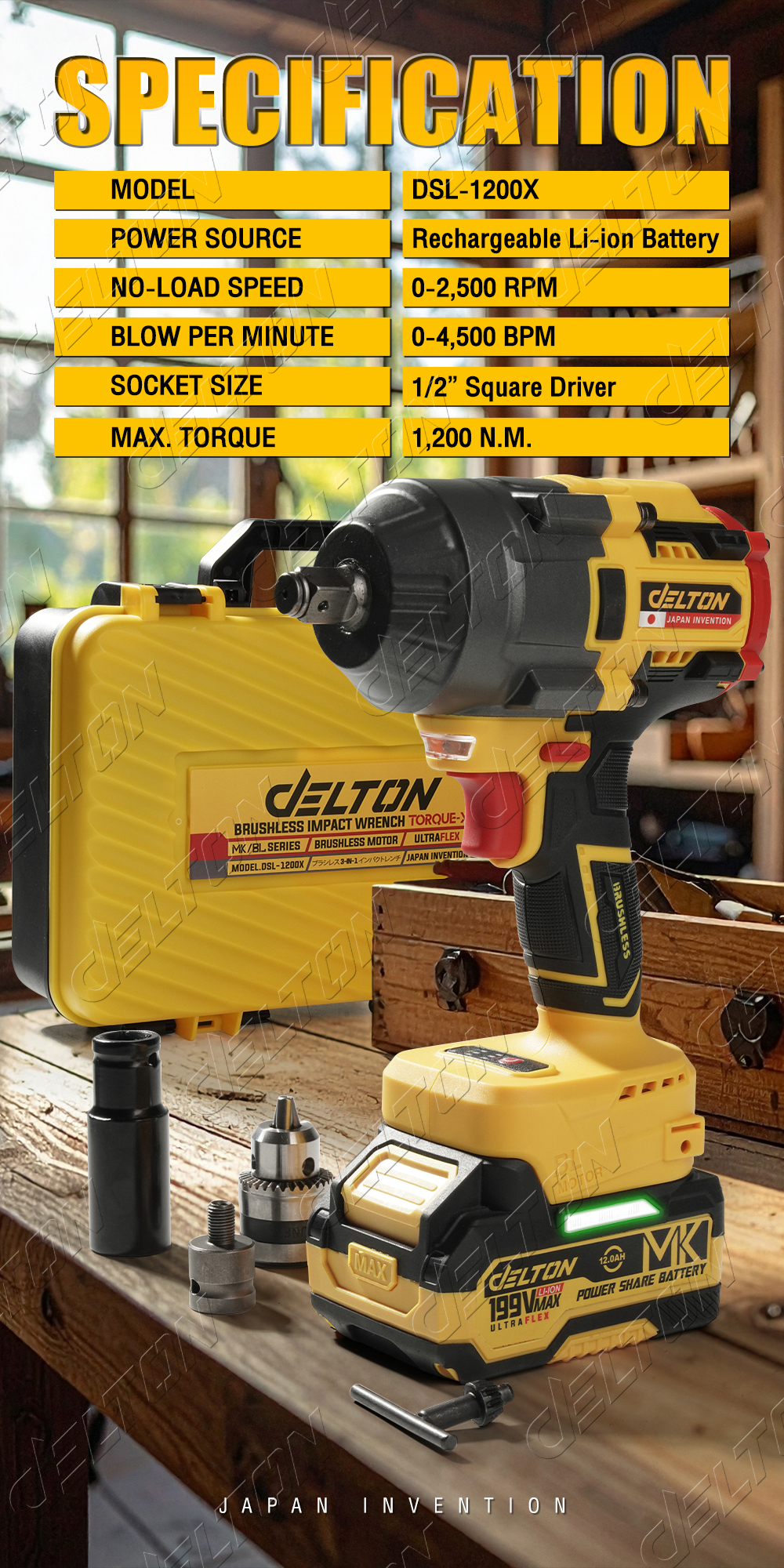 บล็อกแบต & สว่าน มอเตอร์ BRUSHLESS ไร้แปรงถ่าน TORQUE-X รุ่น DSL-1200X บล็อคไฟฟ้าไร้สาย 1/2นิ้ว 880NM บล็อกไฟฟ้า บล็อกไร้สาย MK Series ใช้งานร่วมกับ DELTON UltraFlex แบตเตอรี่ Power Share กลุ่ม MK-Series