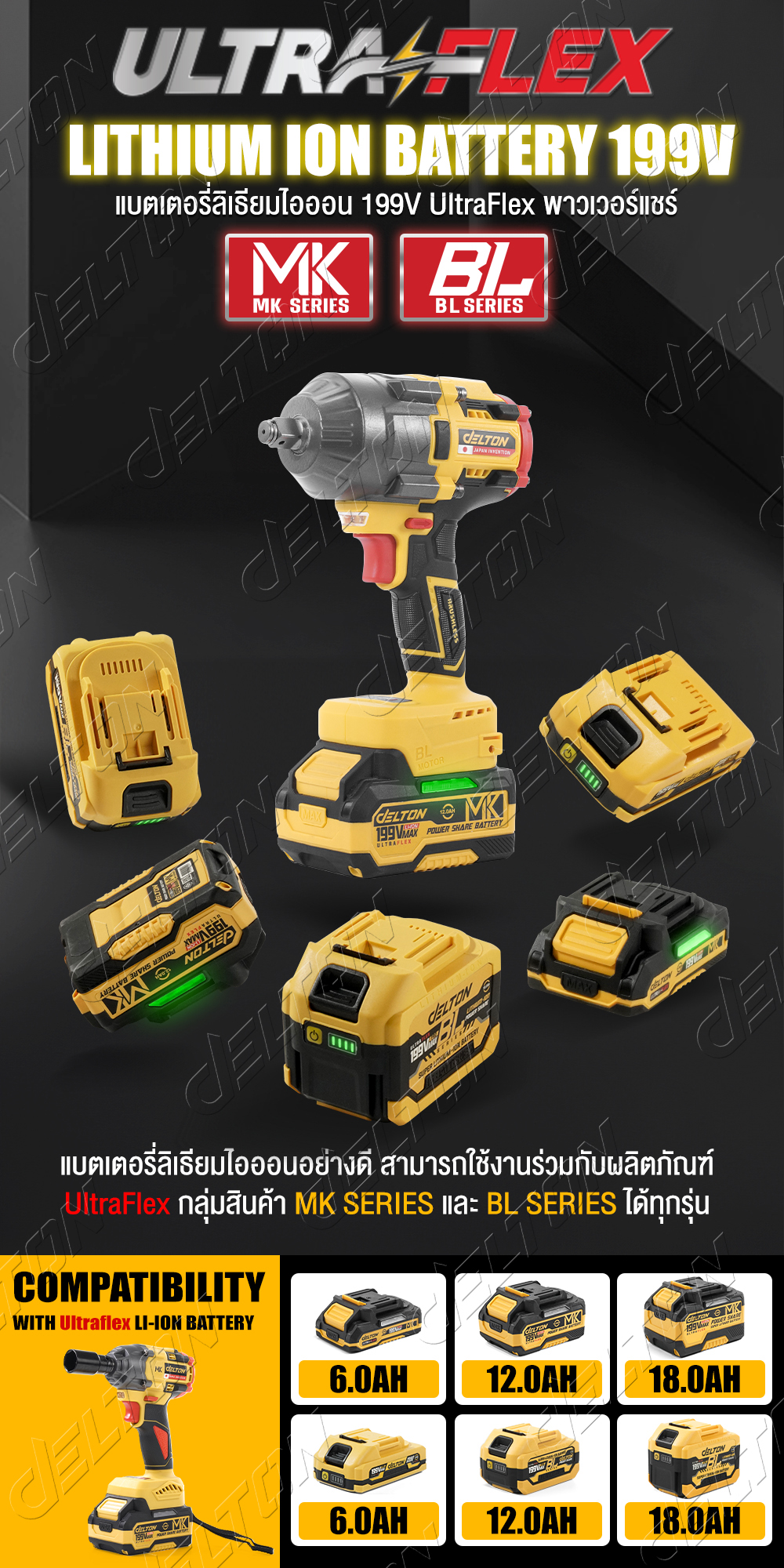 สามารถใช้งานร่วมกับเครื่องมือช่าง แบตเตอรี่ และสายชาร์จพาวเวอร์แชร์ (Power Share) DELTON UltraFlex กลุ่ม MK-Series และ BL-Series ได้