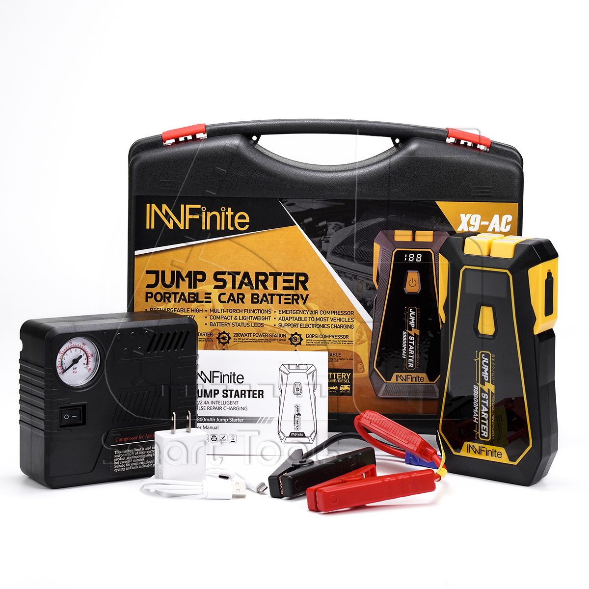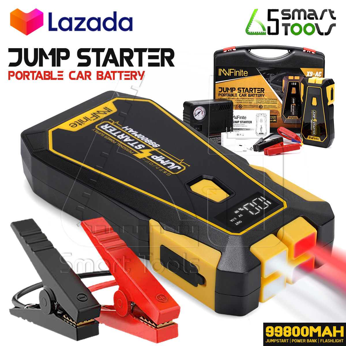 High Power 99,800 mAh ชุดจั้มสตาร์ท พร้อมปั๊มลม + USB 3 พอร์ท อุปกรณ์ช่วยสตาร์ทและชาร์จแบตเตอรี่จาก InnFinite เครื่องเดียวจบ ครบวงจร