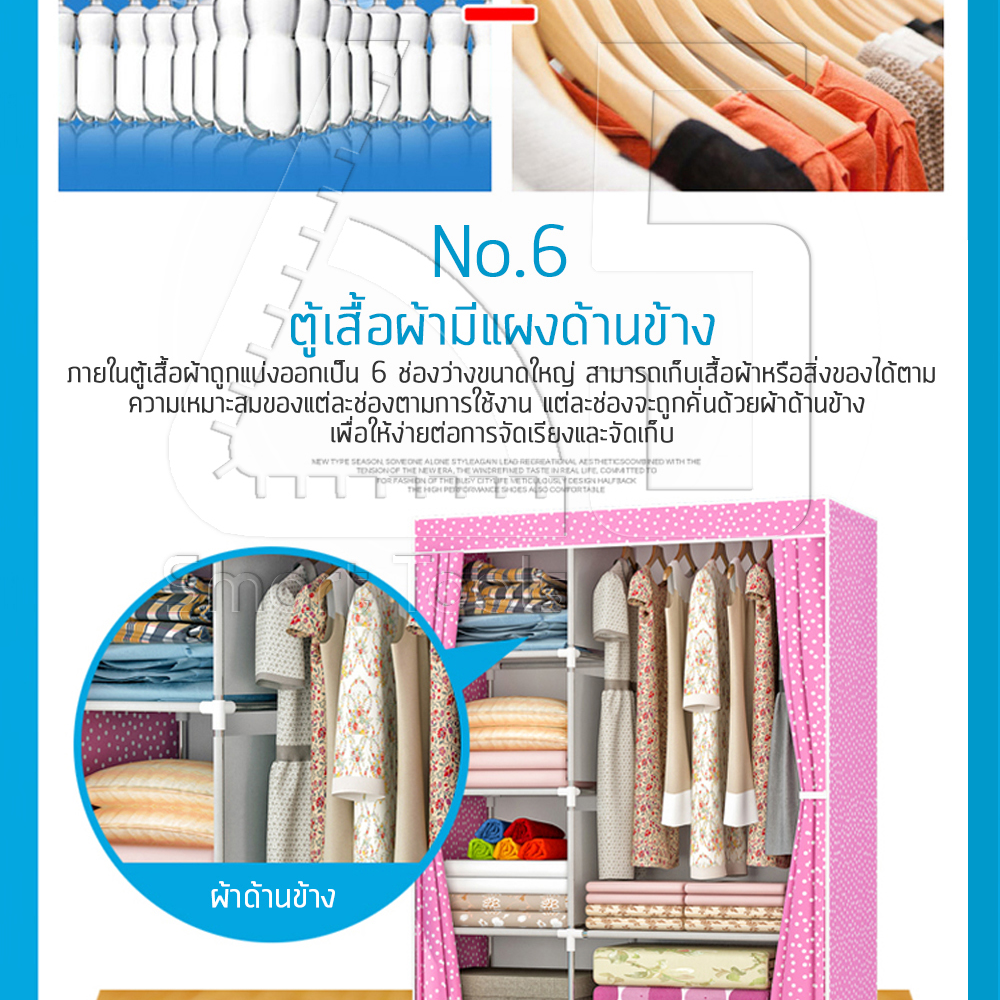 - ตู้เสื้อผ้ามีแผงด้านข้าง แบ่งออกเป็น 6 ช่องว่างใหญ่